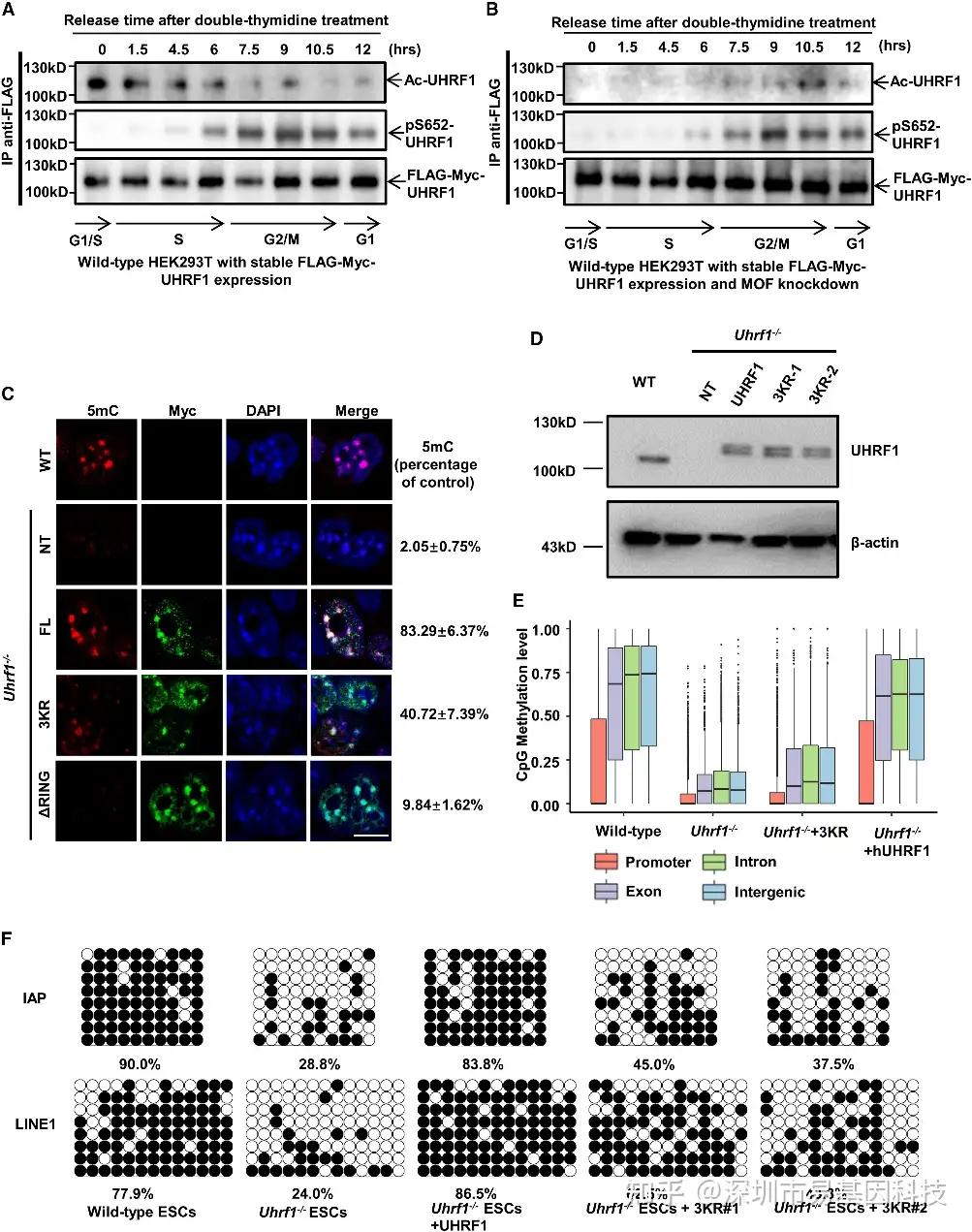 图4:UHRF1的细胞周期依赖性乙酰化及其乙酰化突变体对DNA甲基化维持的影响