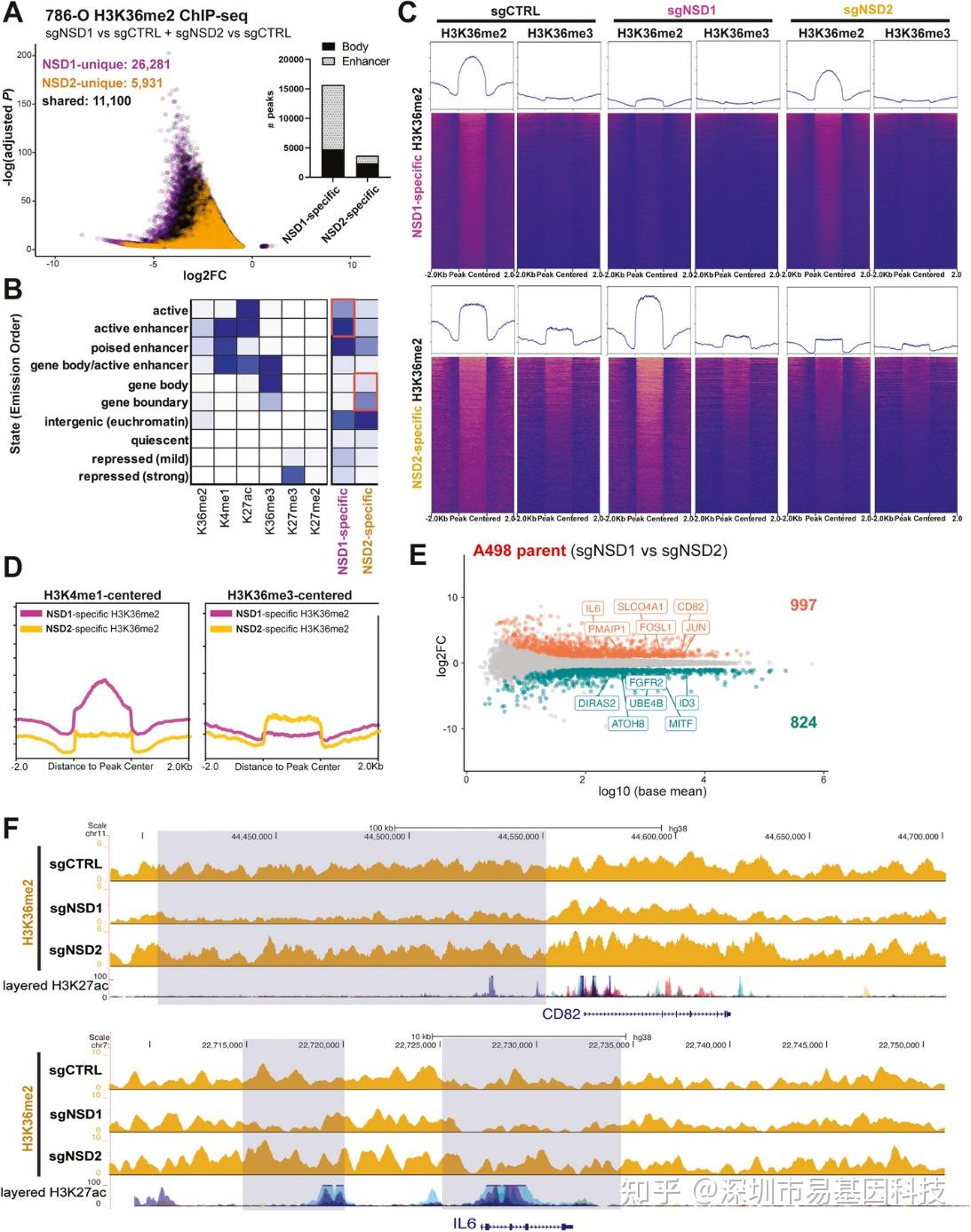 研究发现,尽管NSD1和NSD2都能催化H3K36me2,但它们在基因组上的作用位点和功能存在显著差异。NSD1主要靶向增强子区域,而NSD2主要靶向基因体区域。