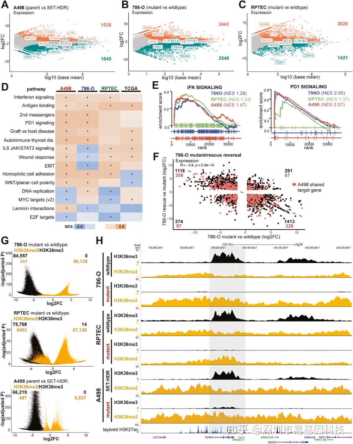 A-C. MA图展示A498、786O和RPTEC同源模型中SETD2突变的差异基因表达。
