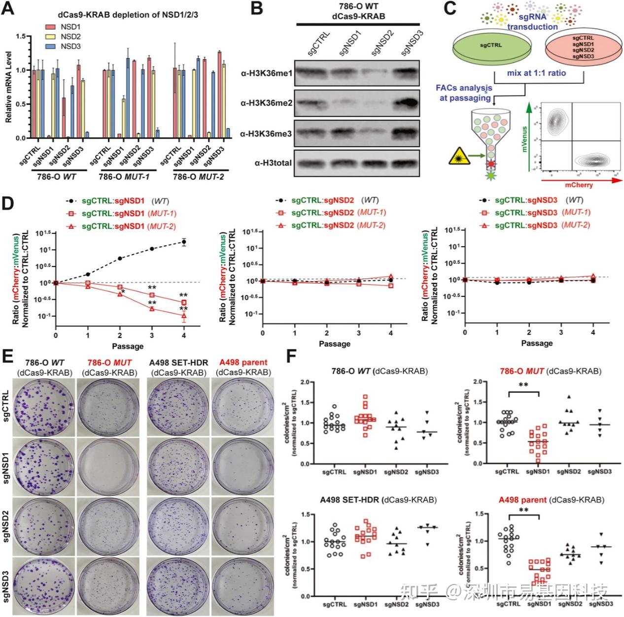 - 在表达dCas9-KRAB的SETD2野生型/突变型786-O细胞系中,通过qRT-PCR分析详细说明各个NSD因子的特异性耗竭情况。