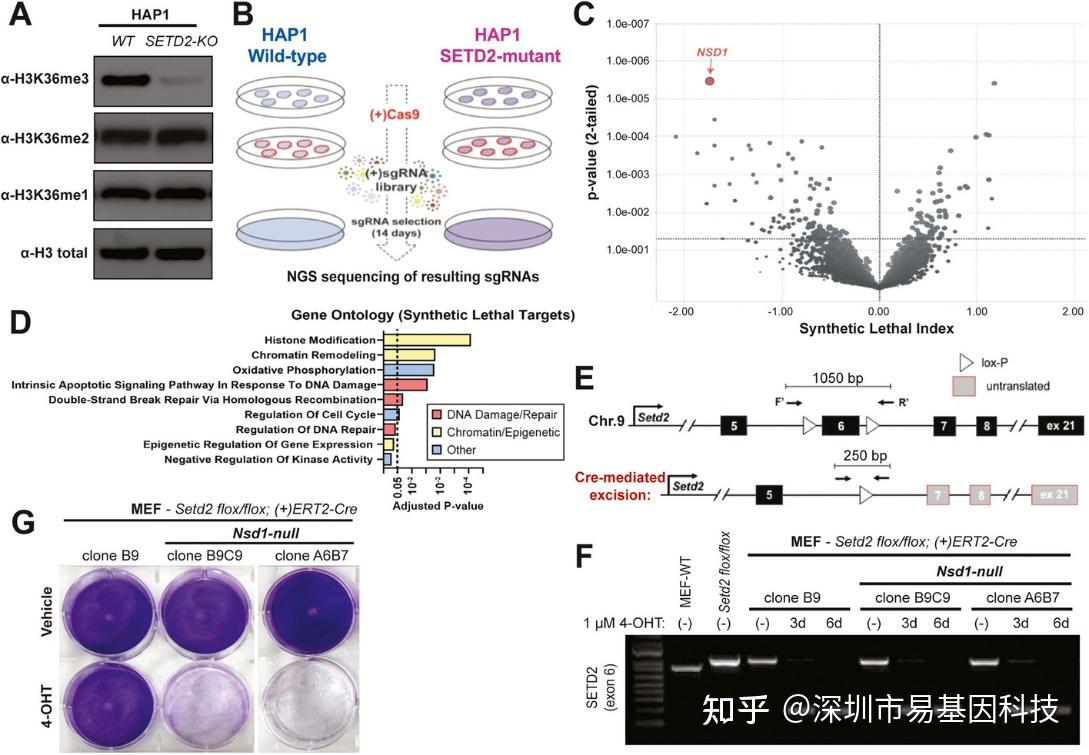 通过CRISPR/Cas9筛选,研究者发现NSD1是SETD2缺失细胞的合成致死修饰因子。在SETD2突变的细胞中,NSD1缺失会导致细胞活力显著下降,伴随DNA损伤和凋亡水平升高。