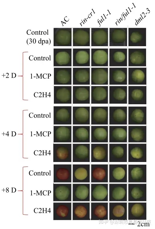 研究了外源乙烯处理对AC、rin-cr1、ful1-1、rin/ful1-1和dml2-3果实成熟的影响。所有果实均在成熟绿期(MG阶段,授粉后30天,30 dpa)采摘,并用外源乙烯利(2 mM)处理5分钟,或用1-MCP(5 ppm)持续处理最长8天。
