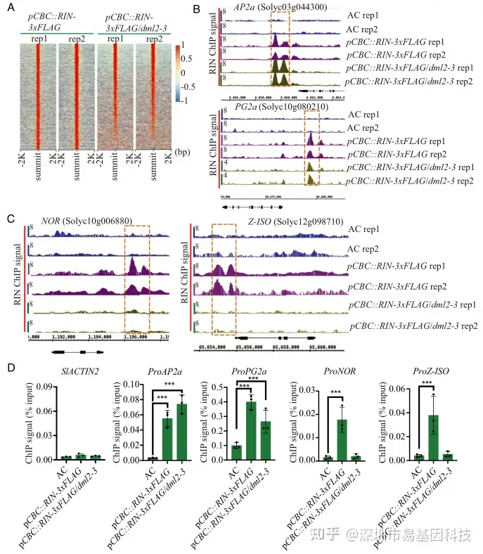 ChIP-seq结果显示,DML2不仅调控RIN和FUL1表达,还影响RIN在其靶基因上的结合。