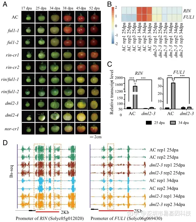 图1:RIN和FUL1在DML2下游冗余地调控番茄果实成熟。
