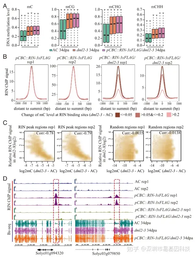 WGBS技术:用于分析野生型和dml2突变体果实的全基因组DNA甲基化模式。通过鉴定DMRs,研究者发现dml2突变体中DNA甲基化增加与RIN结合位点丧失高度相关,揭示了DNA甲基化对RIN结合的调控机制。