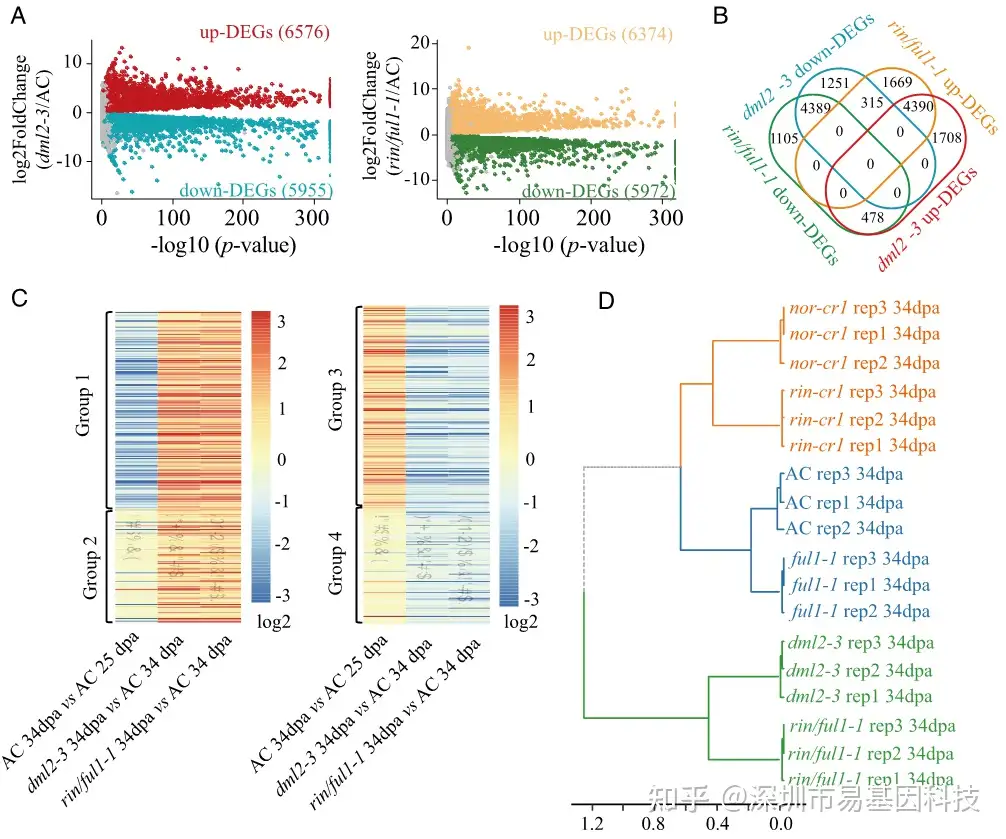 (A)火山图显示dml2-3和rin/ful1-1突变体与AC果实(34 dpa)相比的DEGs。