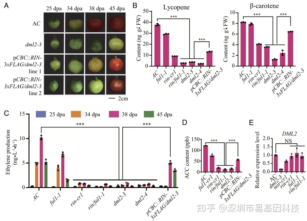 基因编辑与突变体分析:利用CRISPR/Cas9技术生成了DML2、RIN、FUL1等基因的突变体,并分析其果实成熟表型。