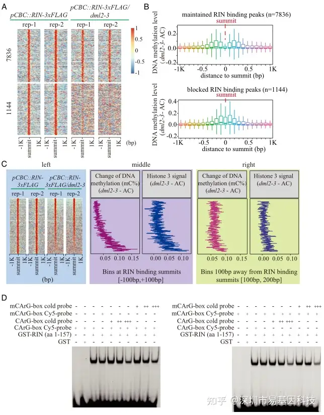 电泳迁移率变化分析(EMSA):体外验证RIN对甲基化和未甲基化CArG-box的结合能力。
