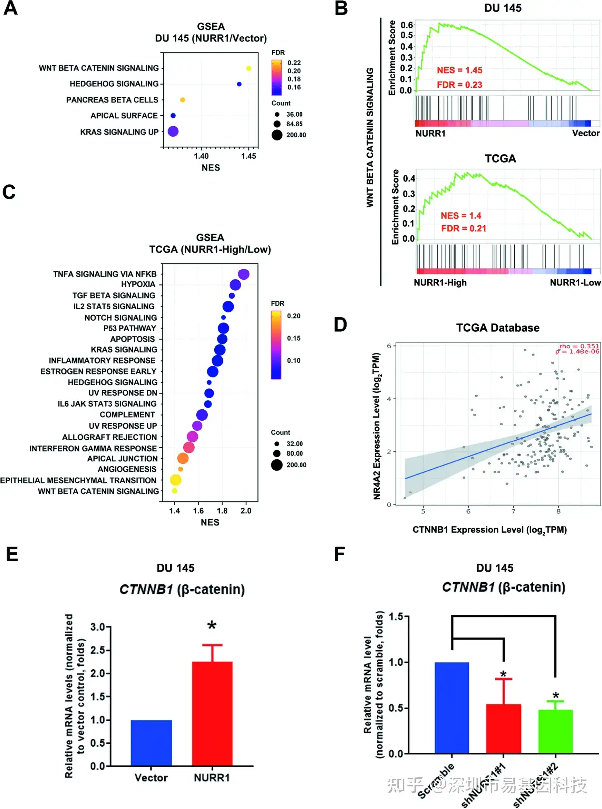 E-F. DU 145-NURR1感染细胞和DU 145-shNURR1感染细胞中CTNNB1(β-catenin)表达的RT-qPCR分析。结果显示,与载体或对照组相比,DU 145-NURR1感染细胞中CTNNB1显著上调,而DU 145-shNURR1感染细胞中CTNNB1表达下调。