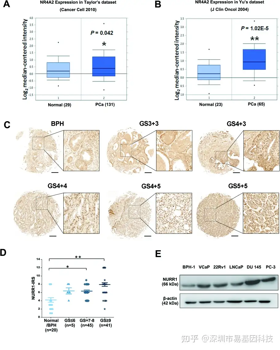 A-B. 通过对两个临床前列腺癌组织的微阵列数据集进行转录组分析,结果显示NURR1在前列腺癌中表现出上调的表达模式。