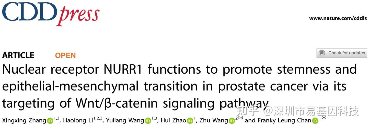 近日,南方医科大学附属深圳龙华医院泌尿外科副研究员王铸博士和香港中文大学医学院Franky Leung Chan合作研究了核受体NURR1(NR4A2)在前列腺癌中的作用机制,特别是其如何通过调控Wnt/β-catenin信号通路影响前列腺癌的干细胞特性、EMT以及去势抵抗性前列腺癌(castration-resistant prostate cancer, CRPC)的进展。研究通过一系列体外和体内实验,结合转录组学(RNA-seq)和表观遗传学技术(ChIP),揭示了NURR1在前列腺癌中的促癌作用,并提出了其作为潜在治疗靶点的可能性。相关研究成果以《Nuclear receptor NURR1 functions to promote stemness and epithelial-mesenchymal transition in prostate cancer via its targeting of Wnt/β-catenin signaling pathway》为题发表于《Cell Death & Disease》期刊。深圳易基因为本研究提供测序分析技术服务。
