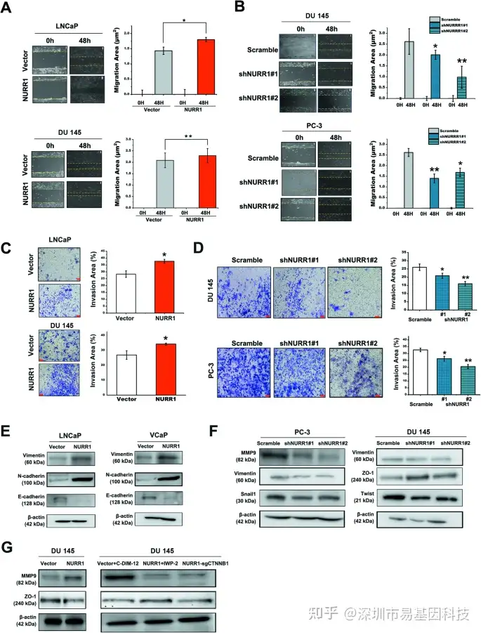 体外实验表明,NURR1过表达能够增强前列腺癌细胞的非贴壁生长能力、迁移和侵袭能力,并诱导EMT相关标志物的表达变化。