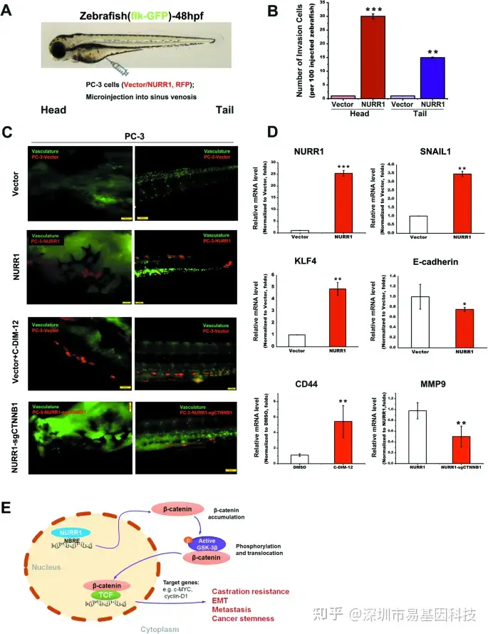 图7:通过斑马鱼胚胎模型验证NURR1能够增强前列腺癌细胞的体内转移潜力