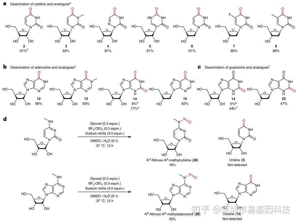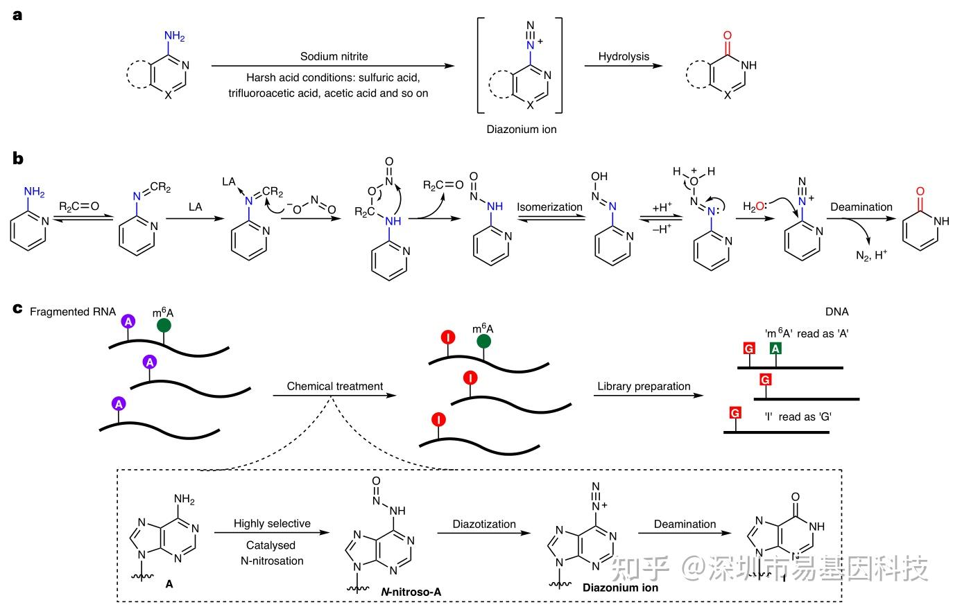 RNA和DNA中的化学修饰在多种生物过程中发挥着关键作用,包括转录调控、RNA降解、蛋白质翻译和免疫调节等。这些修饰已被新的测序方法以单碱基分辨率定量地绘制出来,其中核苷酸脱氨基是一种高效策略,用于选择性地绘制DNA中的5-甲基胞嘧啶(5-methylcytosine)和RNA中的N6-甲基腺苷(m6A)。然而,传统的化学脱氨基方法依赖于在苛刻的酸性条件下使用芳基重氮盐,这限制了其在大多数生物底物中的应用。近年来,基于亚硝酸盐离子的RNA测序方法(如NO-seq和NT-seq)虽然简单且成本效益高,但低转化效率和苛刻的酸处理可能会导致RNA降解,从而影响检测的准确性。此外,GLORI方法虽然提高了脱氨基效率和选择性,但仍受到RNA降解和逆转录停止的限制,需要大量的RNA输入。