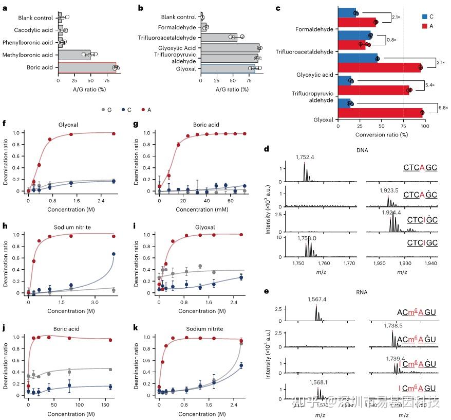 i-k. LC–MS/MS监测RNA寡核苷酸脱氨基反应中甘油醛(i)、硼酸(j)和亚硝酸盐(k)浓度的优化(n=3)。