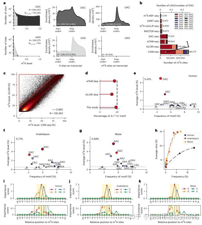 研究者还对拟南芥和玉米的RNA样本进行了分析,发现RAC motif在这些植物中也是最富集的m6A修饰motif。然而,与人类样本不同的是,RAC motif仅占植物中所有m6A位点的40%,而在人类样本中约为85%。此外,植物中AAC motif丰度最高,而在人类中则是GAC motif丰度最高。这些结果表明,植物中的m6A修饰模式与人类存在差异,可能与植物中m6A修饰的调控机制有关。