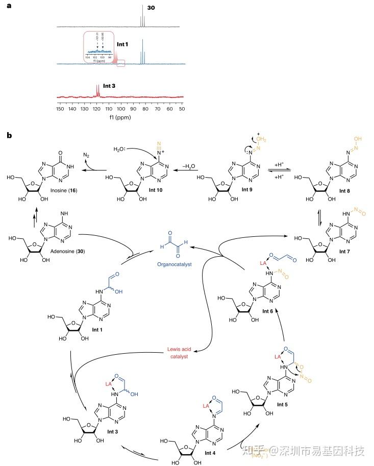 通过15N核磁共振(NMR)光谱学跟踪反应过程,研究者发现,在没有路易斯酸的情况下,15N6腺苷与甘油醛的缩合反应非常缓慢,即使在50℃下加热2小时后,缩合产物的形成仍然很少。然而,加入BF3·OEt2后,15N标记的腺苷在半小时内迅速转化为中间体Int 3。二维1H-15N HMBC光谱学被用来监测路易斯酸催化的缩合反应,具有更高的15N灵敏度。在Na15NO2存在的情况下,15N亚胺信号消失,表明其转化为脂肪族硝基取代的中间体,并随后重排为N-亚硝化加合物。这些结果证实了通过亚胺中间体的反应路径。