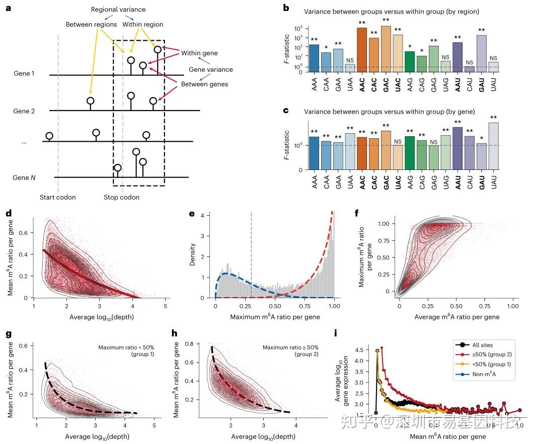 a. 插图展示了A位点的区域和基因分布如何影响基因中m6A修饰水平的变异。