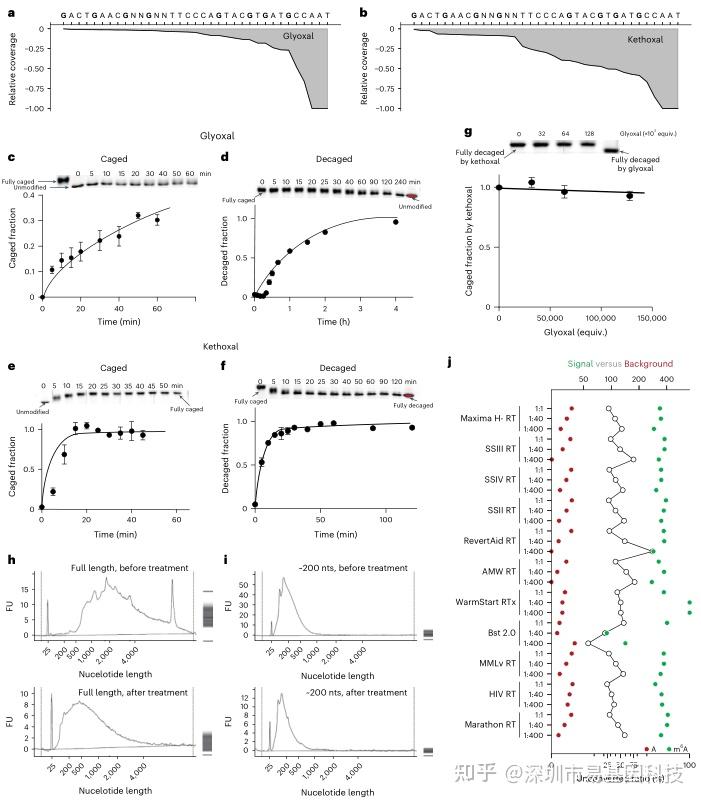 c-f. 在中性条件下,使用甘油醛(c,d)和kethoxal(e,f)对DNA寡核苷酸的笼化(caging)(c,e)和去笼化(decaging)(d,f)动态比较。