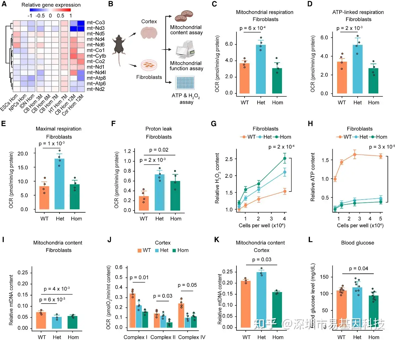 (K) 条形图显示大脑皮层的线粒体DNA含量。