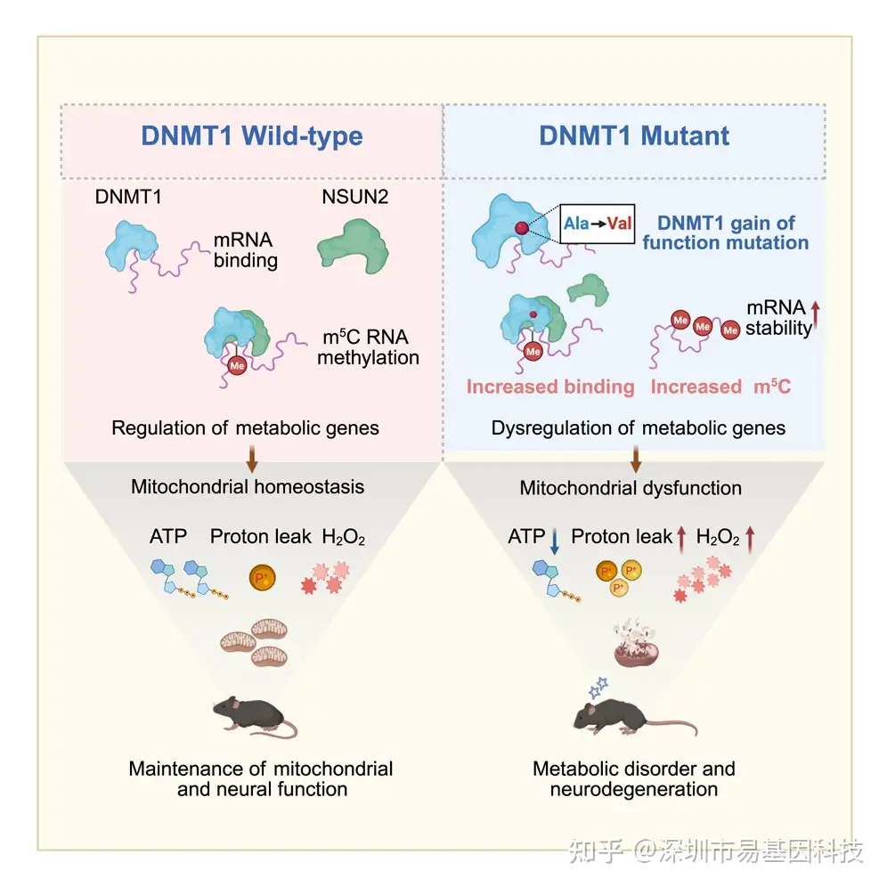 近日,美国加州大学洛杉矶分校终身教授/上海科技大学免疫化学研究所特聘教授范国平课题组揭示了 DNMT1在调控DNA和RNA甲基化中的双重作用,特别是其通过RNA修饰调控线粒体功能的机制。研究发现,DNMT1能够与mRNA结合并促进其稳定性,并通过招募NSUN2蛋白来调节RNA的5-甲基胞嘧啶(m5C)甲基化。此外,研究还发现DNMT1的RFTS结构域突变(如A560V)会导致代谢基因的RNA甲基化和稳定性异常,进而引发线粒体功能障碍和神经退行性疾病。这些发现为理解DNMT1在神经系统疾病中的作用提供了新的视角,并为开发靶向RNA甲基化的治疗策略提供了理论基础。相关研究成果以《DNA methyltransferase 1 modulates mitochondrial function through bridging m5C RNA methylation》为题发表于《Molecular Cell》期刊。易基因科技为本研究提供m5C甲基化测序RNA-BS-seq技术服务。