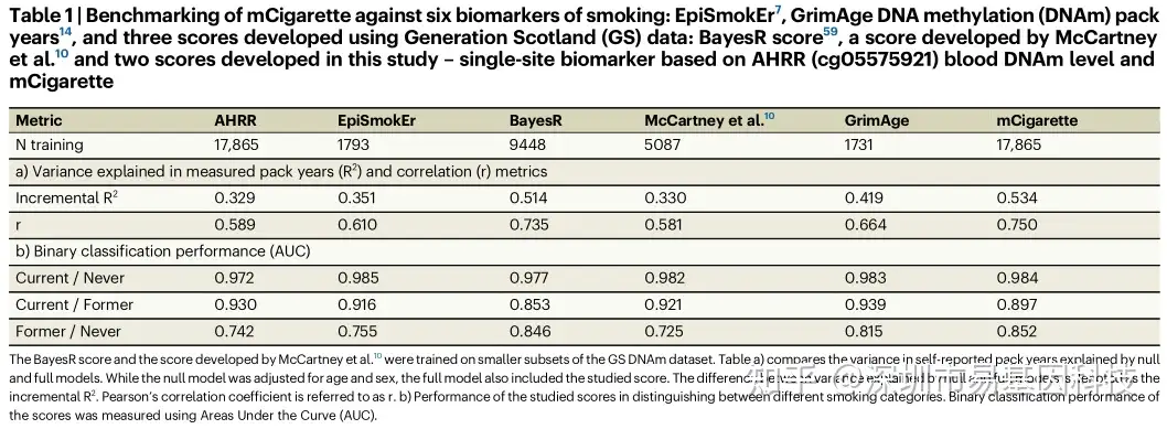 表1:mCigarette与六种吸烟生物标志物的对比基准测试:AHRR(cg05575921)血液DNAm水平的单一位点生物标志物、EpiSmokEr、BayesR评分、由McCartney等人开发的评分、GrimAge、mCigarette。