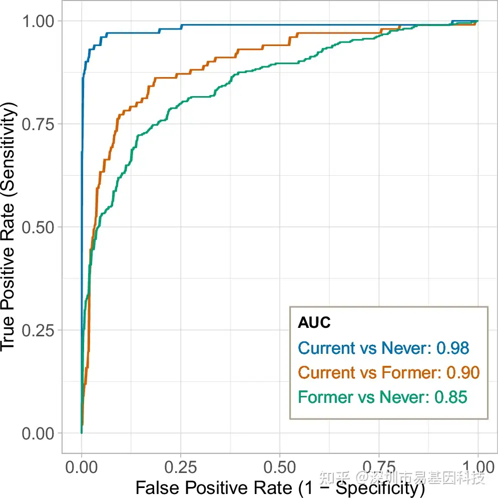 图中显示的曲线下面积(AUC)代表模型区分以下吸烟类别的能力:蓝色表示现吸烟者与从未吸烟者的区分,橙色表示现吸烟者与前吸烟者的区分,绿色表示前吸烟者与从未吸烟者的区分。