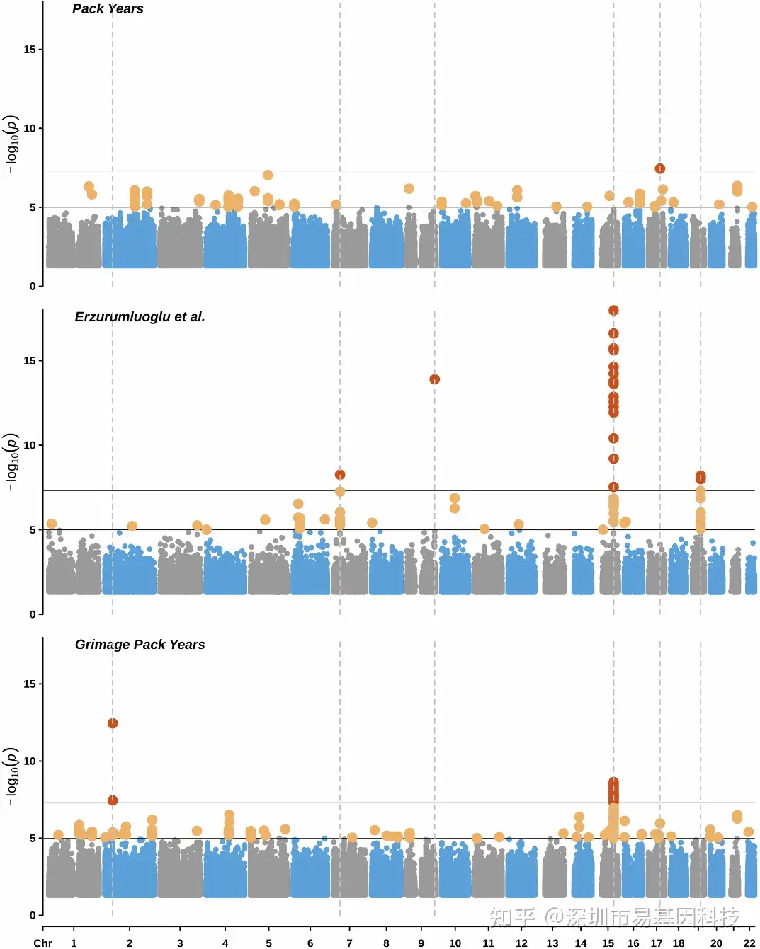 图5:各种全基因组关联研究(GWAS)之间重叠的曼哈顿图