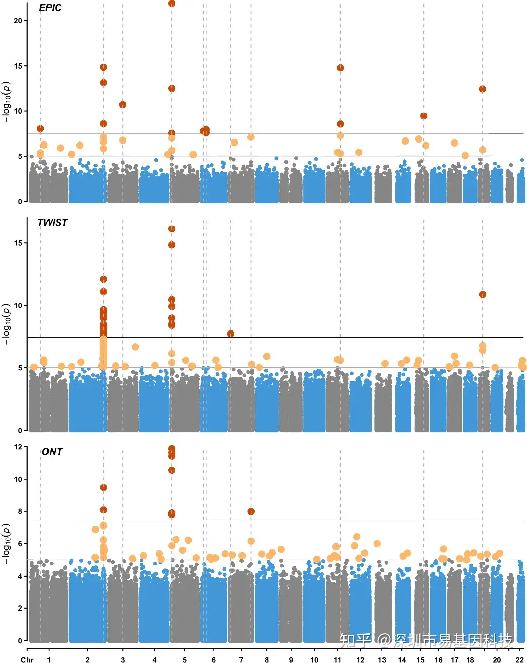 本研究使用三种DNA甲基化数据进行分析:850K芯片、TWIST(4M CpG位点,靶向短读长测序)和ONT测序(2100万个CpG位点,长读长测序)。图中的X轴表示1-22号染色体,Y轴表示-log10(P值)。图中顶部的水平线标记了全基因组显著关联,底部的水平线表示提示性显著性阈值。虚线突出显示了与吸烟状态相关位点。