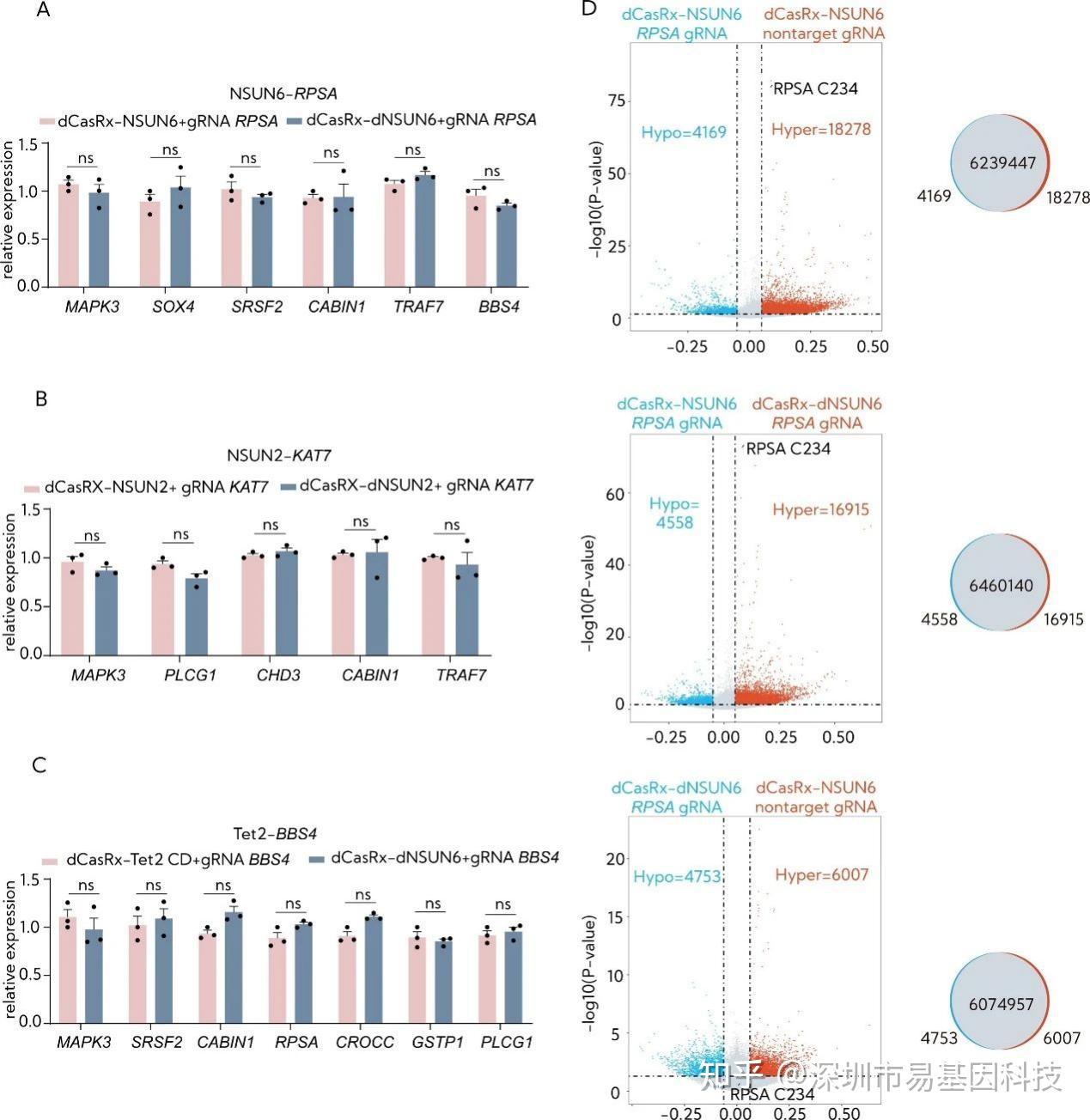 D.用dCasRx-NSUN6或dCasRx-NSUN6和RPSA靶向gRNA或非靶向gRNA转导的HEK293T细胞中m5C甲基化位点的差异富集。三个独立的生物学重复进行BS-seq分析。