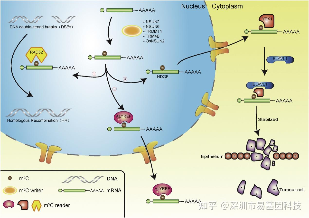 结合蛋白(“readers”):目前已知的mRNA m5C修饰的结合蛋白包括Aly/REF出口因子(ALYREF)和Y盒结合蛋白1(YBX1)。这些蛋白能够识别并结合m5C修饰的mRNA,从而影响mRNA的稳定性和出核。