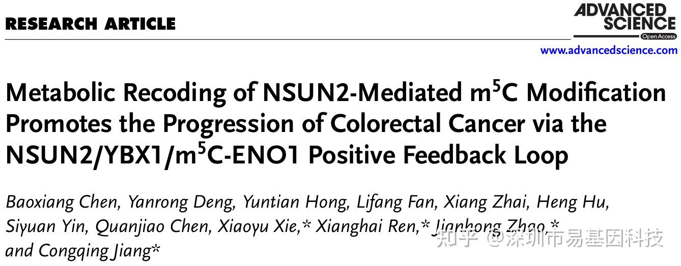 标题:Metabolic Recoding of NSUN2-Mediated m5C Modification Promotes the Progression of Colorectal Cancer via the NSUN2/YBX1/m5C-ENO1 Positive Feedback Loop(NSUN2介导m5C修饰的代谢重新编码通过NSUN2/YBX1/m5C-ENO1正反馈回路促进结直肠癌进展)