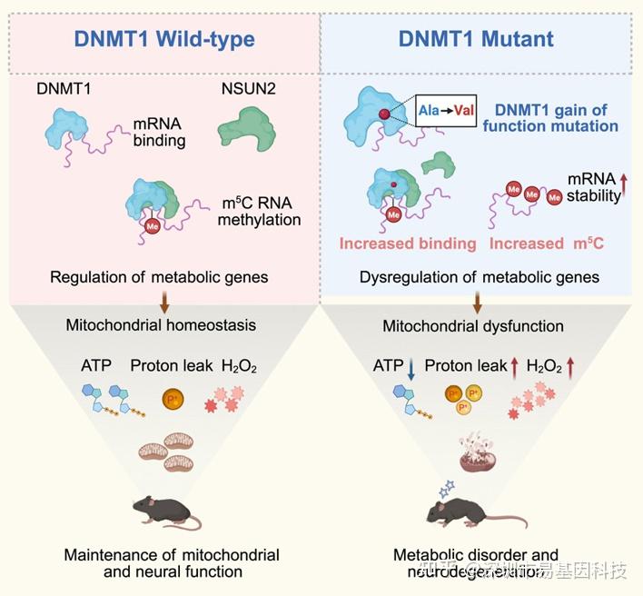 美国加州大学洛杉矶分校终身教授/上海科技大学免疫化学研究所特聘教授范国平课题组揭示了 DNMT1在调控DNA和RNA甲基化中的双重作用,特别是其通过RNA修饰调控线粒体功能的机制。研究发现,DNMT1能够与mRNA结合并促进其稳定性,并通过招募NSUN2蛋白来调节RNA的5-甲基胞嘧啶(m5C)甲基化。此外,研究还发现DNMT1的RFTS结构域突变(如A560V)会导致代谢基因的RNA甲基化和稳定性异常,进而引发线粒体功能障碍和神经退行性疾病。这些发现为理解DNMT1在神经系统疾病中的作用提供了新的视角,并为开发靶向RNA甲基化的治疗策略提供了理论基础。相关研究成果以《DNA methyltransferase 1 modulates mitochondrial function through bridging m5C RNA methylation》为题发表于《Molecular Cell》期刊。易基因科技为本研究提供m5C甲基化测序RNA-BS-seq技术服务。