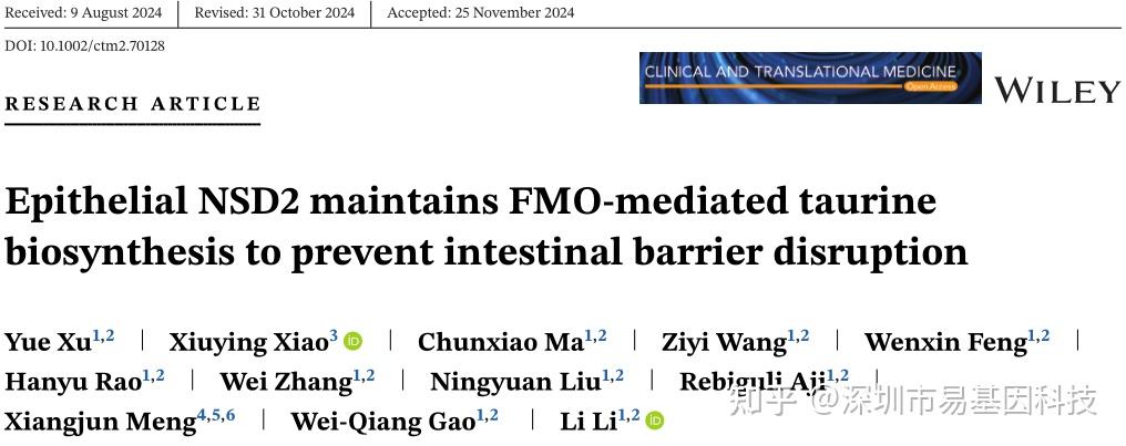 Xu Y, Xiao X, Ma C, Wang Z, Feng W, Rao H, Zhang W, Liu N, Aji R, Meng X, Gao WQ, Li L. Epithelial NSD2 maintains FMO-mediated taurine biosynthesis to prevent intestinal barrier disruption. Clin Transl Med. 2024 Dec;14(12):e70128. doi: 10.1002/ctm2.70128.