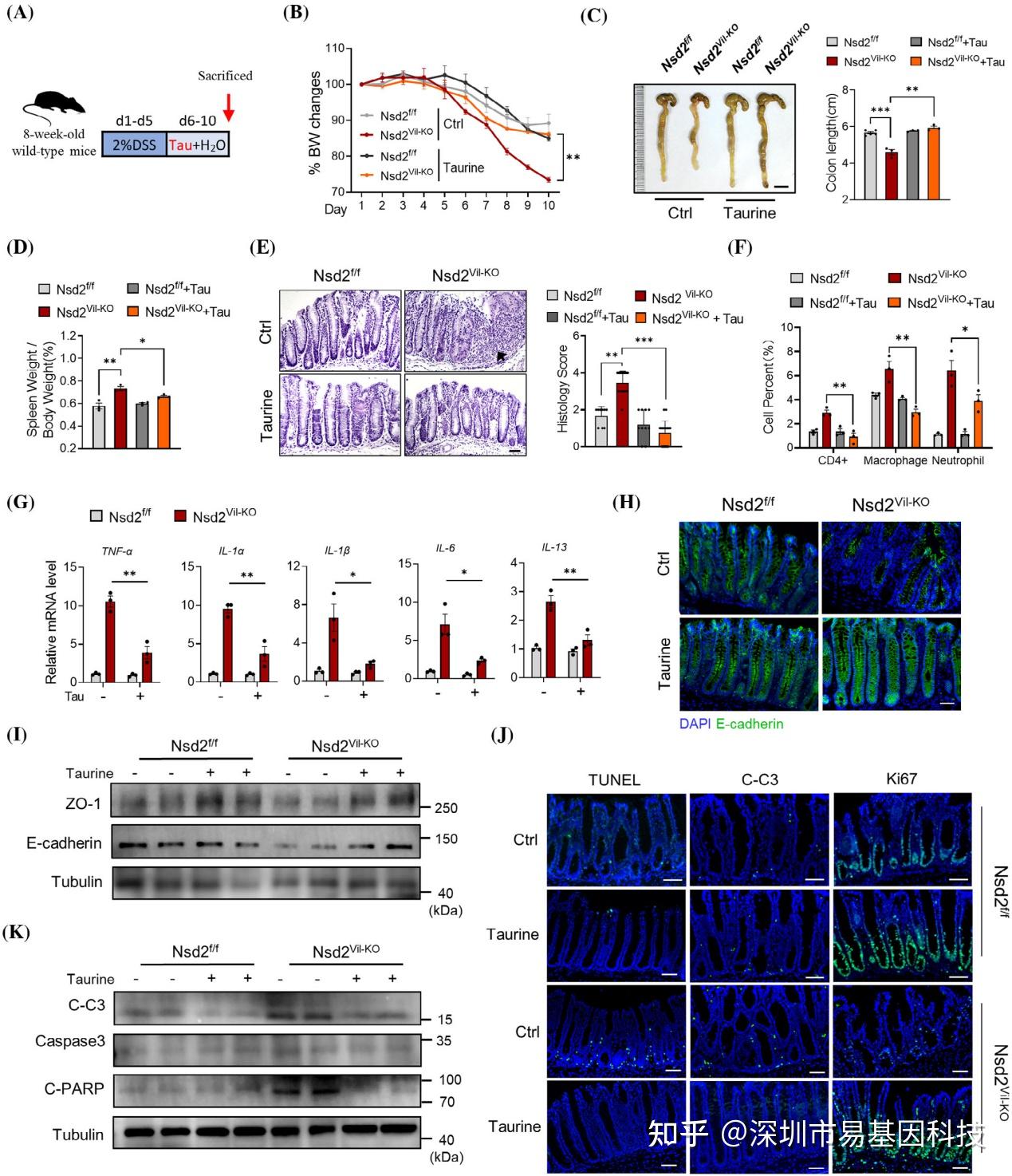 通过给NSD2缺失的小鼠补充牛磺酸,研究发现其能够显著缓解IBD症状,包括体重下降、结肠缩短、脾脏肿大和组织学损伤,减少炎症细胞浸润和促炎细胞因子产生,恢复肠道屏障功能。