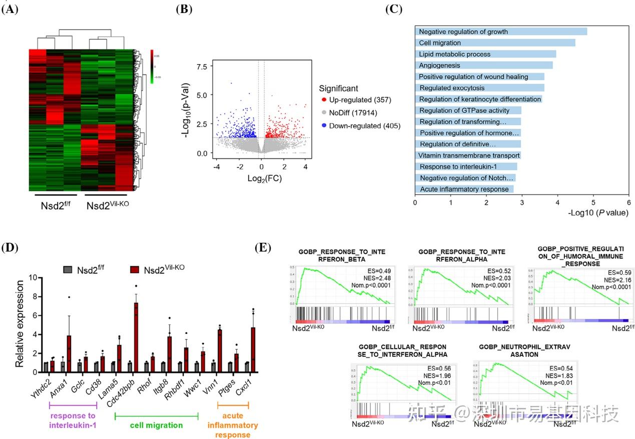 通过RNA-seq研究发现NSD2缺失导致肠道上皮细胞中与免疫细胞迁移、对白介素-1的反应和急性炎症反应相关的基因表达显著变化,进一步证实了NSD2缺失加剧肠道炎症反应。