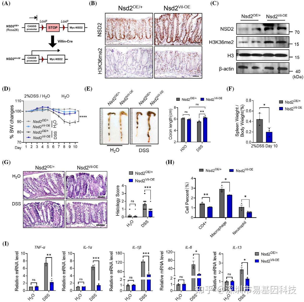 通过在IECs中过表达NSD2的小鼠模型,研究发现这些小鼠在DSS诱导的IBD中表现出较少的症状,结肠组织损伤和炎症特征减少,表明NSD2过表达对IBD具有保护作用。