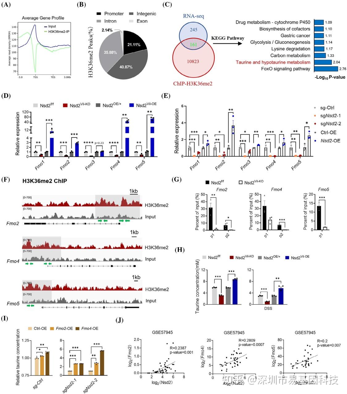 通过ChIP-seq分析,研究发现NSD2缺失导致Fmo2、Fmo4和Fmo5(牛磺酸合成酶)的H3K36me2占据率降低,mRNA表达下调,进而导致牛磺酸浓度降低。此外,通过补充Fmo2和Fmo4,可以恢复牛磺酸水平,表明NSD2通过调节FMOs的表达来影响牛磺酸的合成。