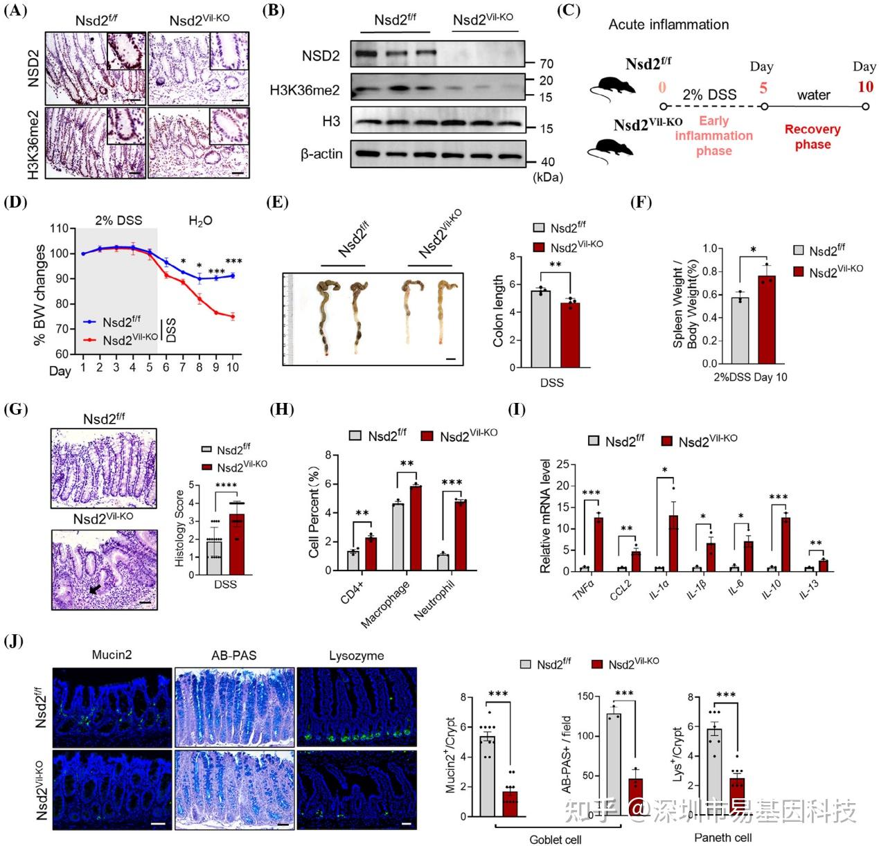 通过基因编辑小鼠模型,研究发现NSD2缺失的小鼠在DSS诱导的IBD中表现出更严重的症状,包括加速的体重下降、更明显的结肠缩短和脾脏肿大。组织学检查显示,NSD2缺失的小鼠结肠组织中炎症细胞浸润、腺窝侵蚀更严重,组织学评分更高。
