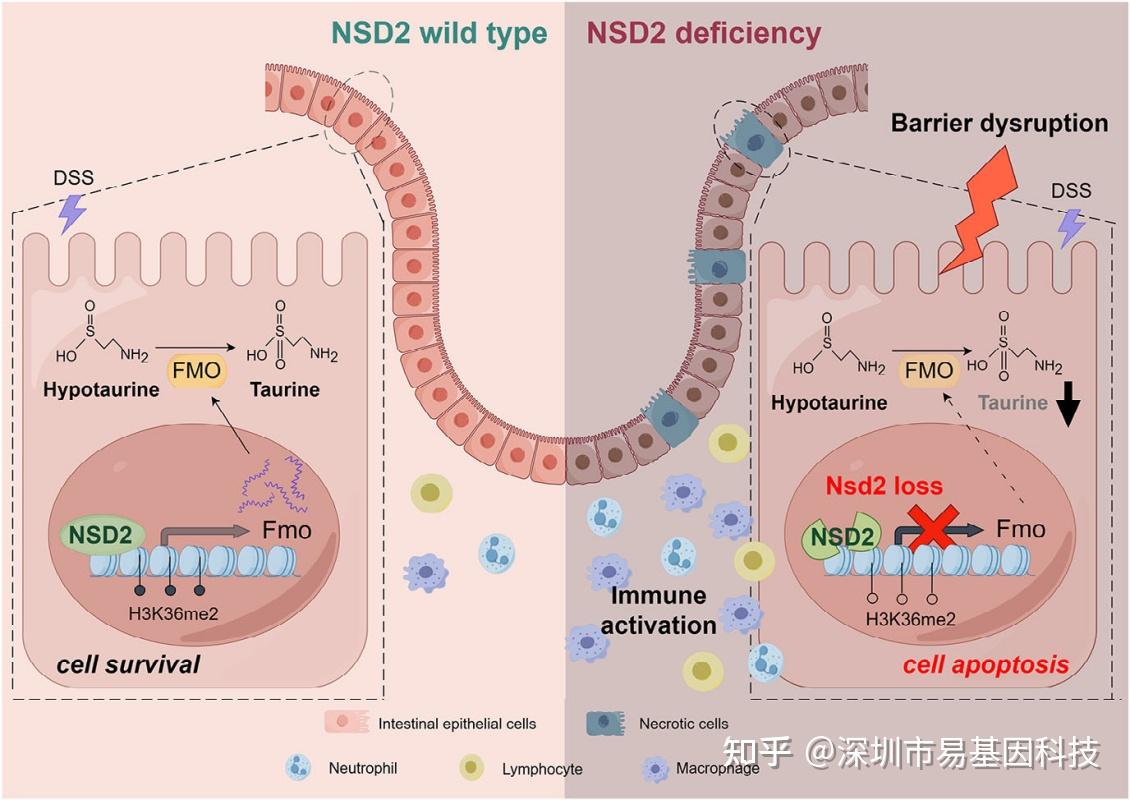 - NSD2缺失导致H3K36me2和FMO(牛磺酸合成酶)mRNA下调,从而导致IECs中牛磺酸生物合成减少。