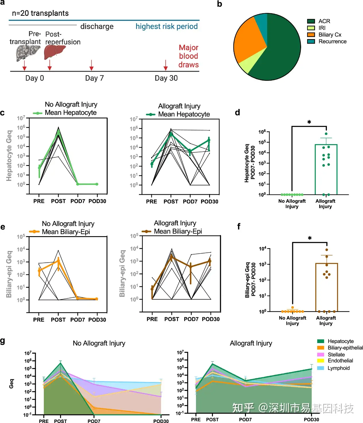 研究发现,在术后第一个月内,持续检测到肝细胞和胆管上皮细胞cfDNA的升高与移植物损伤相关。这些cfDNA升高可以作为早期诊断移植物损伤的非侵入性标志物。