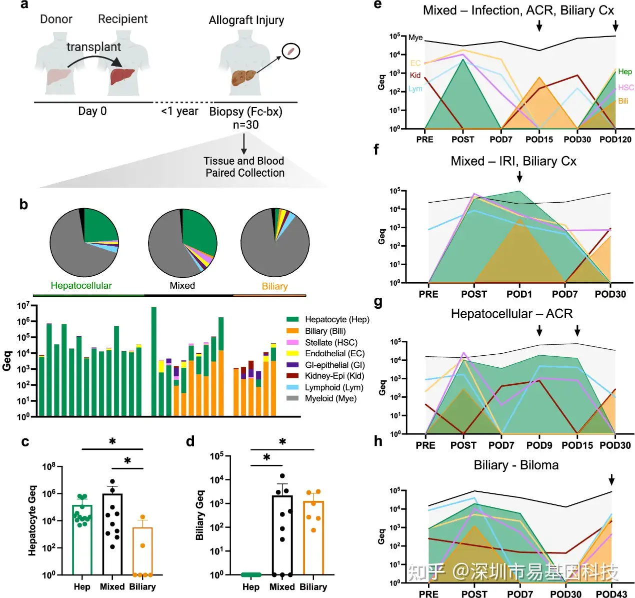 - 在有胆管或混合肝胆损伤的血清样本中,与单纯的肝细胞损伤相比,胆管cfDNA水平。(b–d 血清样本被分类为n=14份肝细胞损伤,n=10份混合肝胆损伤,n=6份胆管损伤的移植物损伤病因)