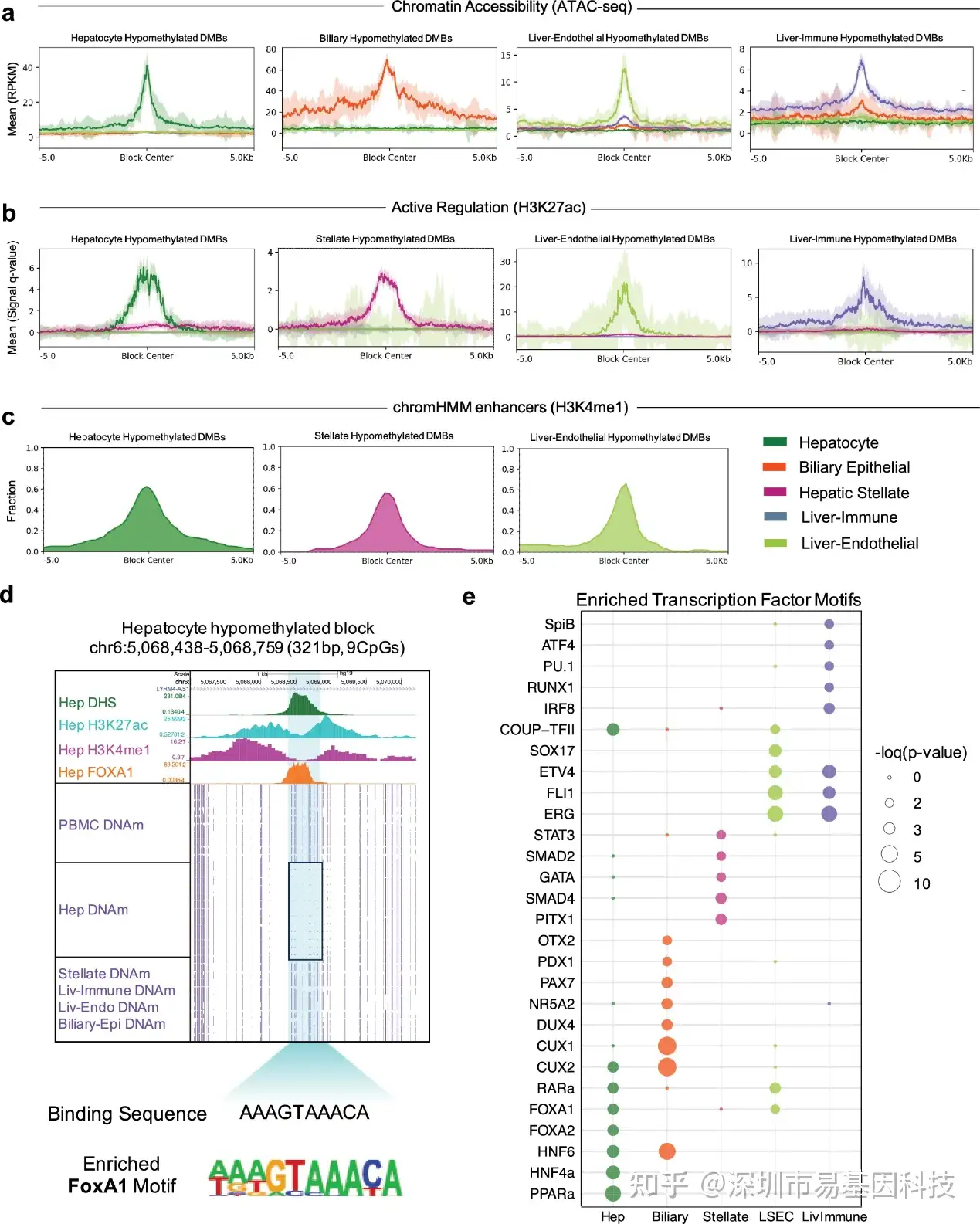 - HOMER motif分析在肝细胞类型特异性低甲基化区域中富集先锋(Pioneer)和发展(development)转录因子结合位点。肝细胞的DHS、H3K27ac和H3K4me1数据来自德国表观基因组计划(DEEP)。肝细胞的FOXA1 ChIP-seq数据来自ENCODE项目。胆管上皮细胞的ATAC-seq数据和肝星状细胞的H3K27ac组蛋白修饰数据来自ENCODE项目。