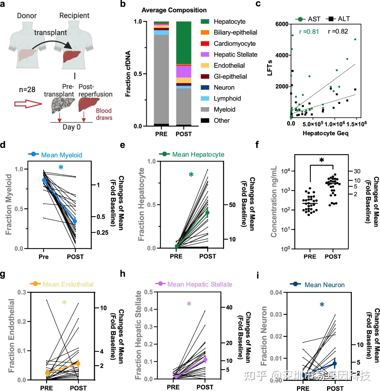 d-f. 术前(PRE)和再灌注后(POST)来自髓系细胞(d)、肝细胞(e)、内皮细胞(g)、肝星状细胞(h)和神经细胞(i)的cfDNA比例。以粗体显示的是患者群体的平均值±标准误(SEM)。右侧轴:相对于术前的变化倍数。(f)从患者血清中分离出的cfDNA浓度。