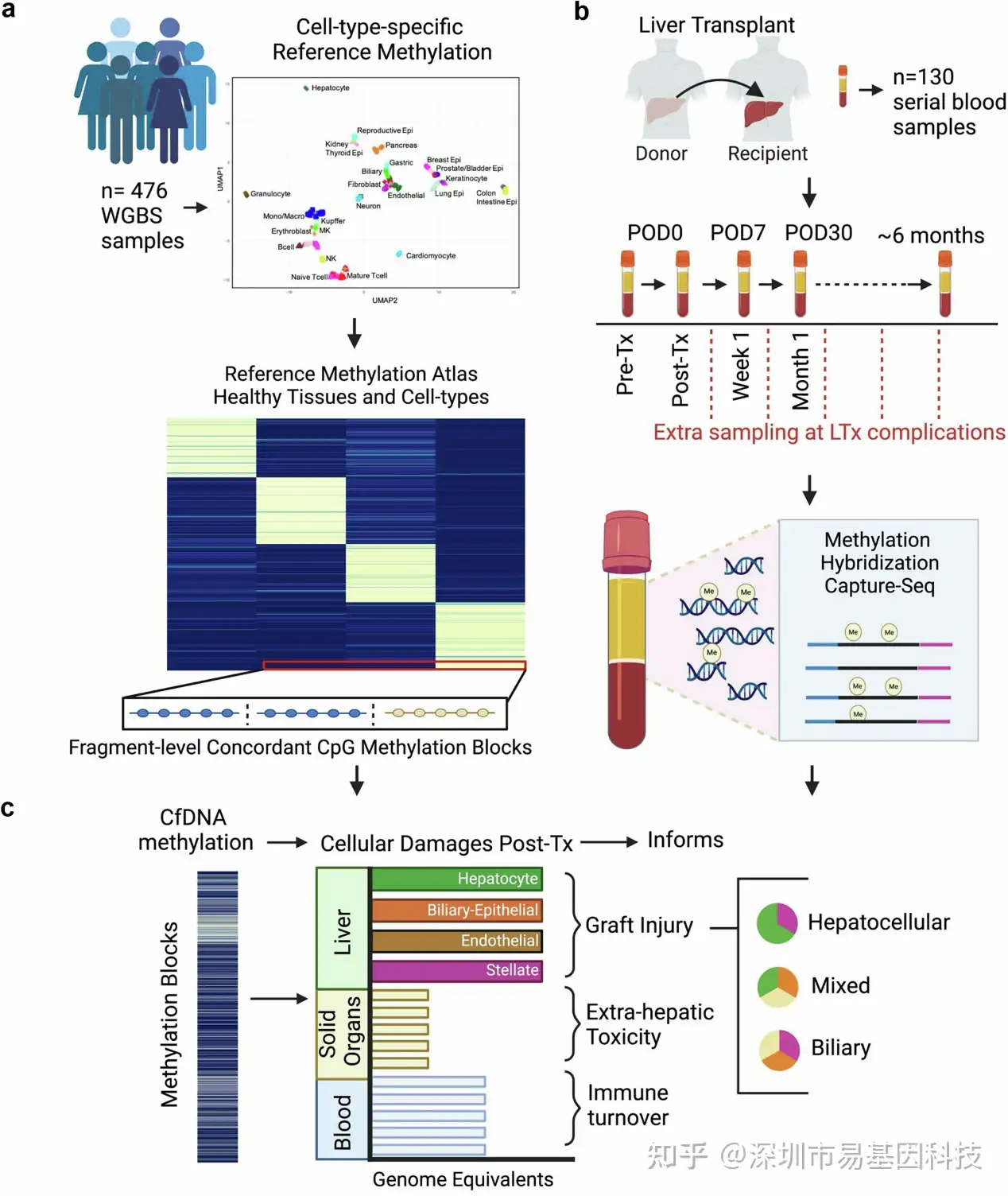 移植后的并发症会降低同种异体移植物和受者的存活率。目前用于非侵入性检测移植器官损伤的方法有限,且无法区分细胞机制。本研究通过分析肝脏移植后由死亡细胞释放到循环细胞游离DNA(cell-free DNA, cfDNA)片段,来监测细胞损伤。研究分析了44名患者在移植后不同时间点采集的130份血液样本。将基于序列的cfDNA片段甲基化模式比对到一个由476个纯化细胞的甲基化组(methylomes)来源细胞类型特异性(cell-type-specific)DNA甲基化模式图谱中。肝脏细胞类型的DNA甲基化模式和多组学数据综合分析表明在开放染色质和功能重要的调控区域有显著富集。在没有移植器官损伤的患者中,多组织细胞损伤在术后第一周内恢复。然而,如果在术后第一个月内持续检测到肝细胞和胆管上皮细胞cfDNA升高,则表明存在早期移植器官损伤。此外,cfDNA组成变化可以区分移植器官损伤的不同原因,显示出非侵入性监测和干预的潜力。