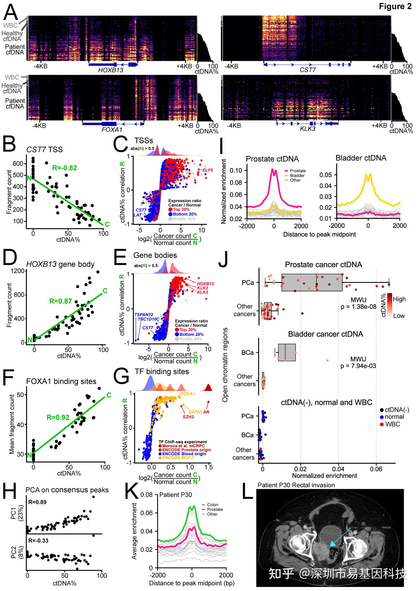 研究团队分析了71份血浆样本和7份白细胞样本,涵盖了34名转移性前列腺癌患者、5名转移性膀胱癌患者和7名健康对照者。通过cfChIP-seq技术,研究团队检测了cfDNA中与激活的启动子和增强子相关的H3K4me2组蛋白修饰。cfChIP-seq分析结果表明,前列腺癌基因(如HOXB13、FOXA1、KLK3和FOLH1)在ctDNA阳性样本中的H3K4me2密度显著高于ctDNA阴性样本,而血液特异性基因(如CST7)则相反。研究还发现,ctDNA%与H3K4me2密度在前列腺癌基因中的相关性较强,表明cfChIP-seq能够捕获前列腺癌特异性的生物学特征。