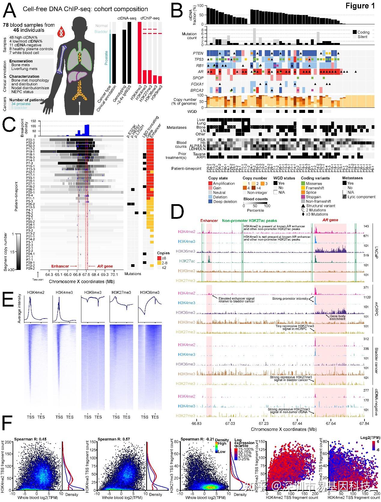 图 1:晚期前列腺癌患者的血浆 cfChIP-seq 及其全面的临床基因组学注释。