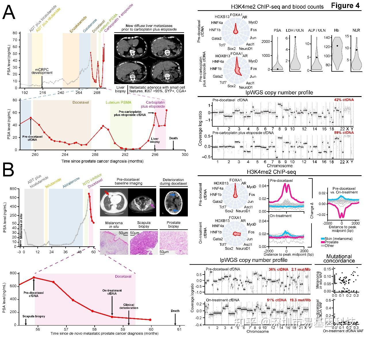 - 左侧:P14患者治疗史、影像学检查及组织病理学结果。多西他赛前的CT影像显示广泛的转移性疾病,包括肺部(红色箭头)和盆腔(粉色)病灶。临床恶化与多发新脑转移(蓝色)的出现同时发生。转移性肩胛骨活检的H&E染色显示低分化恶性肿瘤,伴有广泛肿瘤坏死,与55个月前取样的原发性前列腺腺癌活检无相似之处。右上角:比较多西他赛前和治疗中cfDNA样本的H3K4me2 cfChIP-seq和全基因组拷贝数图。雷达图显示TF motif富集的-log(p)值。折线图显示特定于不同癌症类型的开放染色质区域中H3K4me2的空间分布。右下角:P14的两个cfDNA样本的全基因组拷贝数图谱。VAF散点图比较第二份cfDNA样本与黑色素瘤原位活检和第一份cfDNA样本。在三个样本中检出的所有突变均已显示。