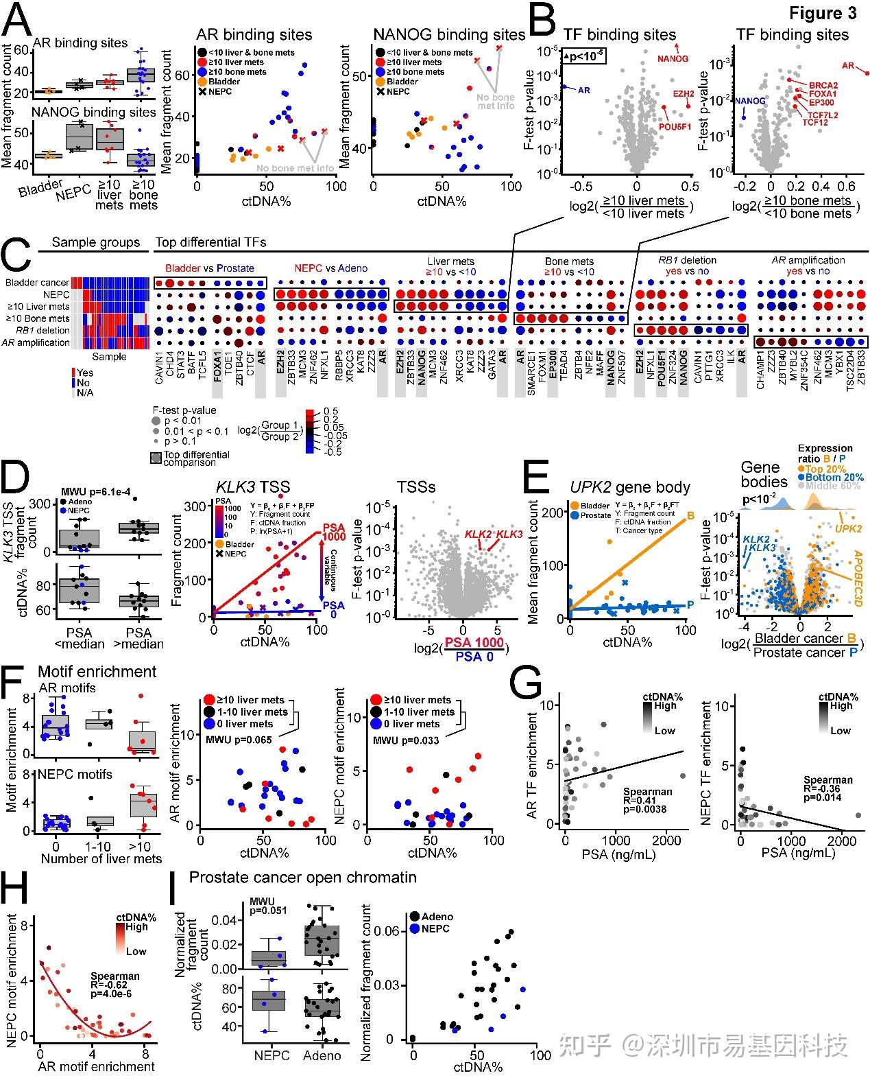 - 在ctDNA阳性mPCa中,AR和NEPC-TF motif富集之间存在负相关。