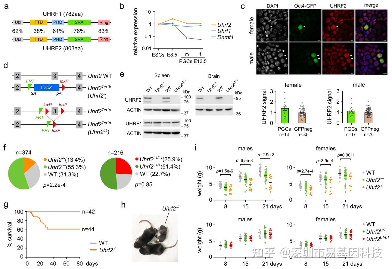 图2:Uhrf2在PGCs中的表达及Uhrf2基因敲除小鼠特征